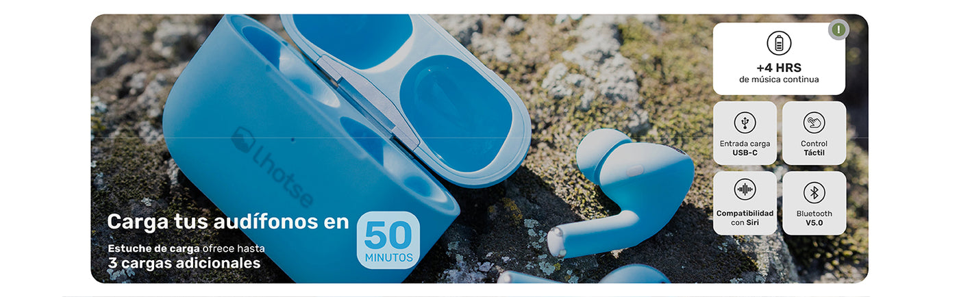 - 4+ horas de música continua y estuche que ofrece hasta 3 cargas adicionales.