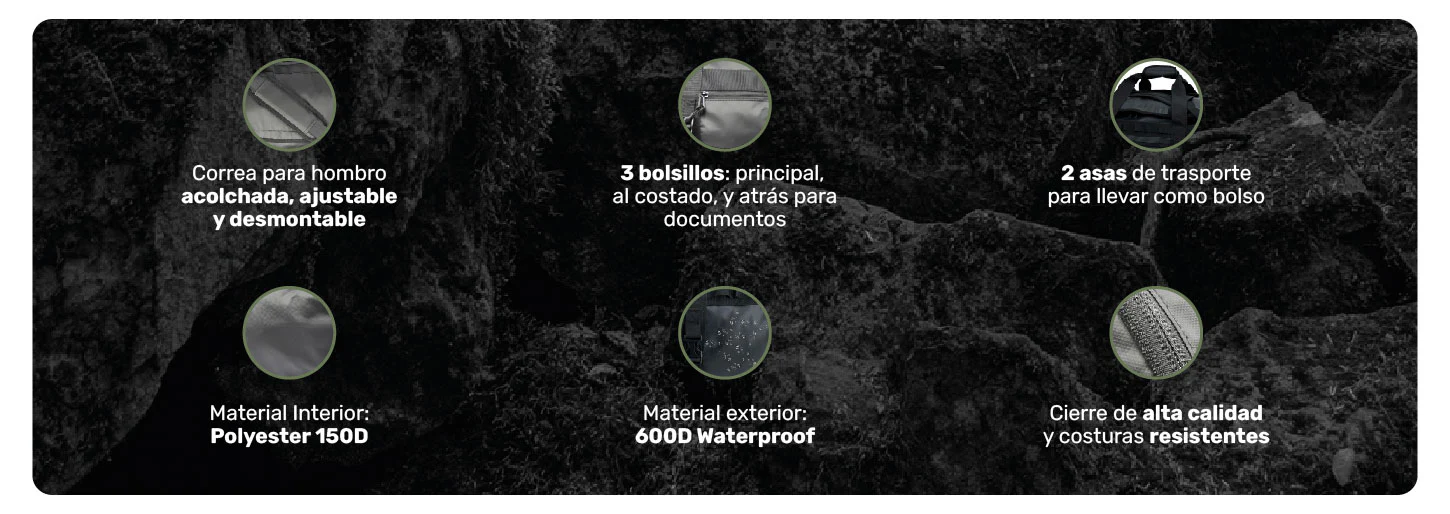 • Bolsillos: 3 (principal, al costado y atrás para documentos)