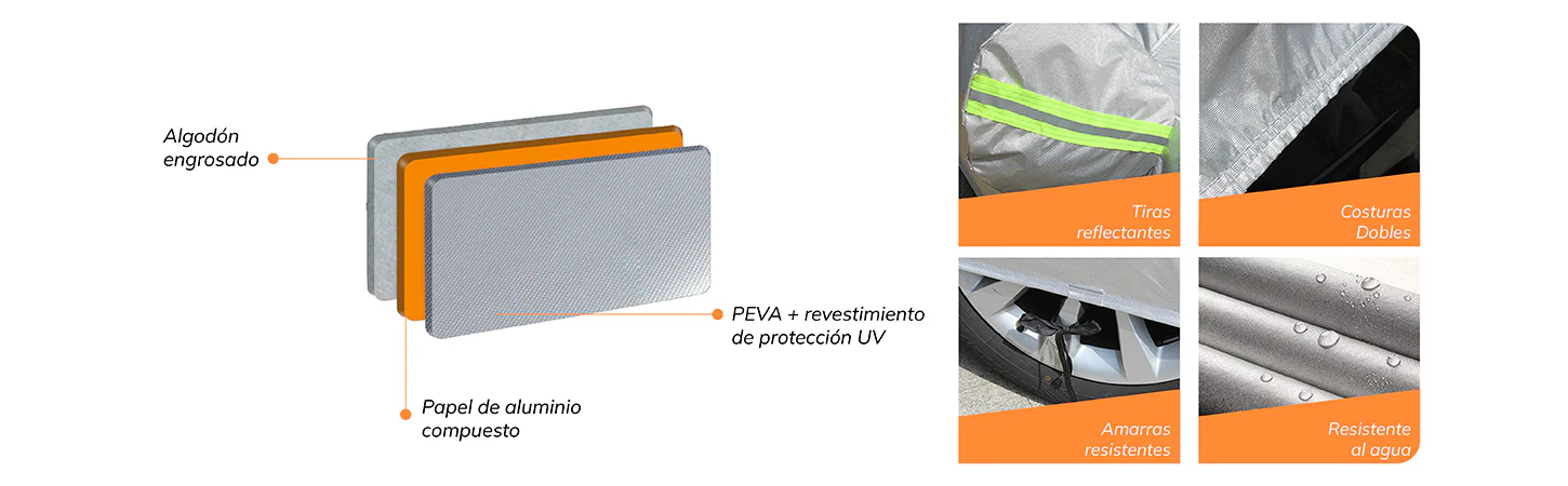 El material exterior resiste el calor extremo y cuenta con protección UV para aumentar la vida útil de la pintura de tu vehículo.