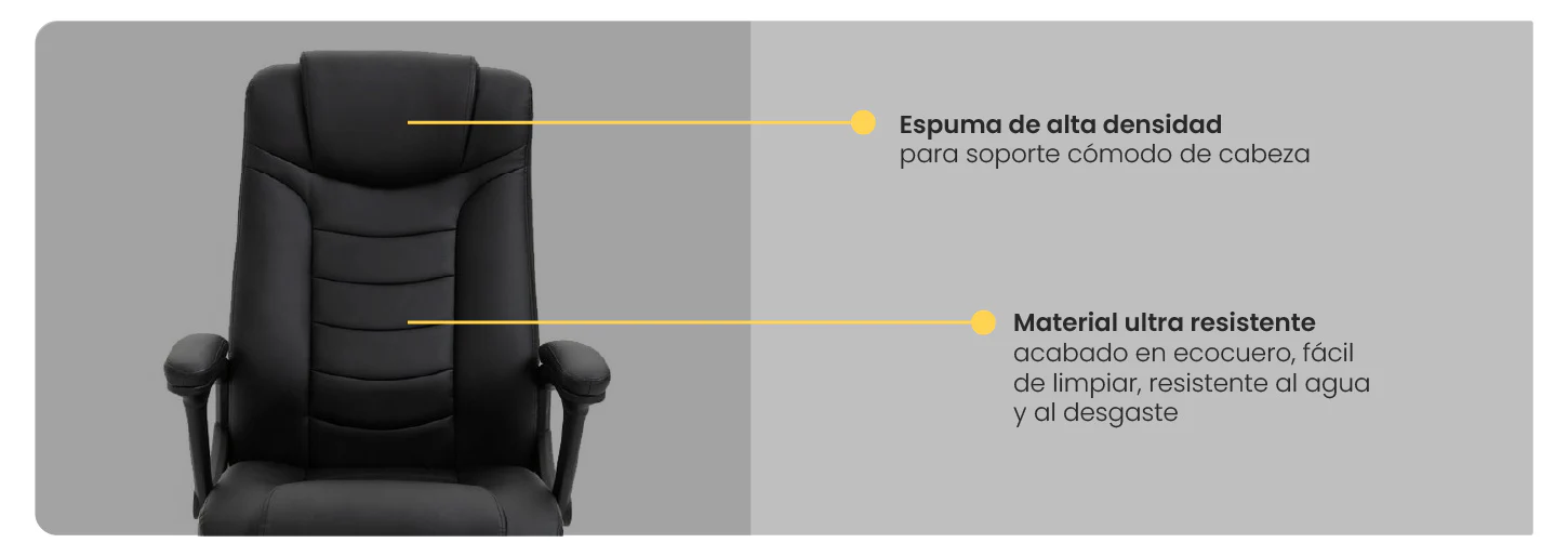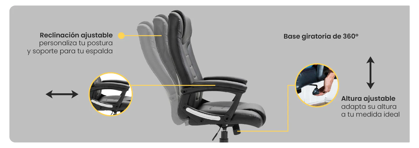 Con una estructura de nylon resistente y un acolchado firme en ecocuero, la LEVO Ejecutiva está diseñada para soportar hasta 120 kg, garantizando durabilidad y estabilidad en el día a día.