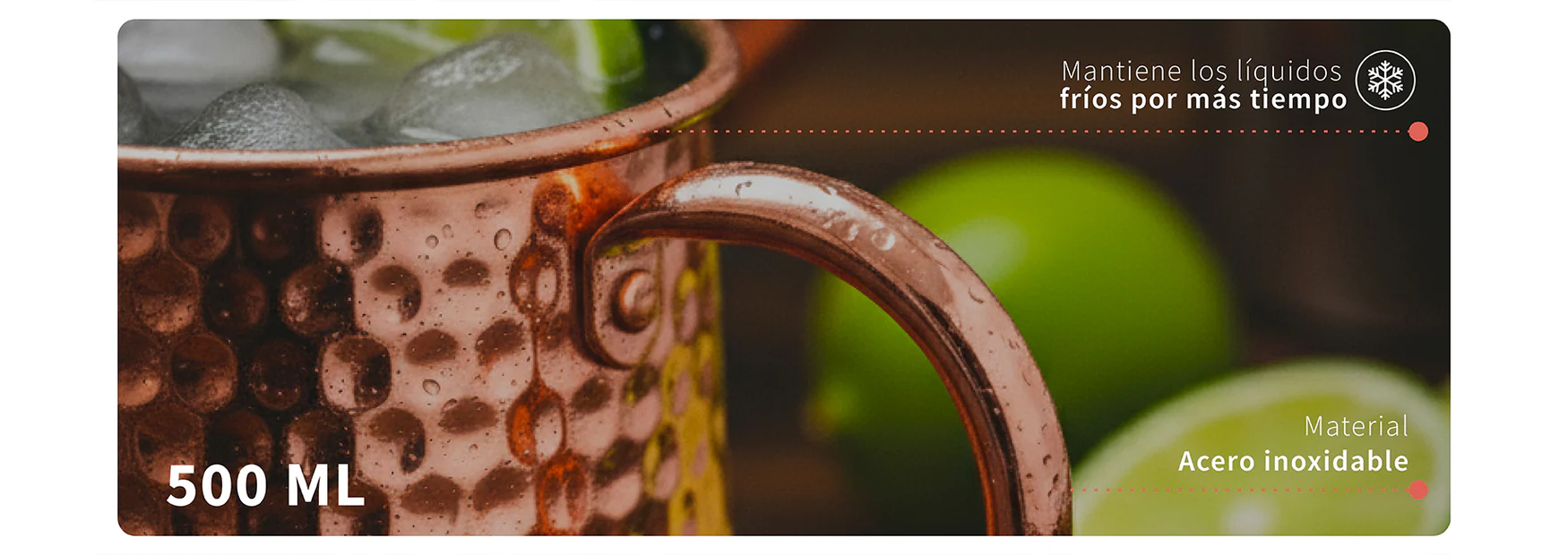 Descubre el encanto contemporáneo del set de 2 vasos Moscow Mule de acero inoxidable recubiertos de cobre, que incluyen dos bombillas. Estos elegantes vasos combinan la durabilidad del acero inoxidable con el atractivo del cobre, brindando una experiencia de bebida sofisticada y moderna. Su materialidad de acero inoxidable recubierto de cobre no solo es visualmente atractiva, sino que también ayuda a mantener el frío del licor, asegurando que tu Moscow Mule se mantenga refrescante hasta el último sorbo. Las dos bombillas adicionales añaden un toque distintivo y te permiten compartir esta deliciosa bebida con un compañero. ¡Disfruta de esta clásica bebida con estilo, calidad excepcional y el placer de mantenerla fría durante más tiempo!