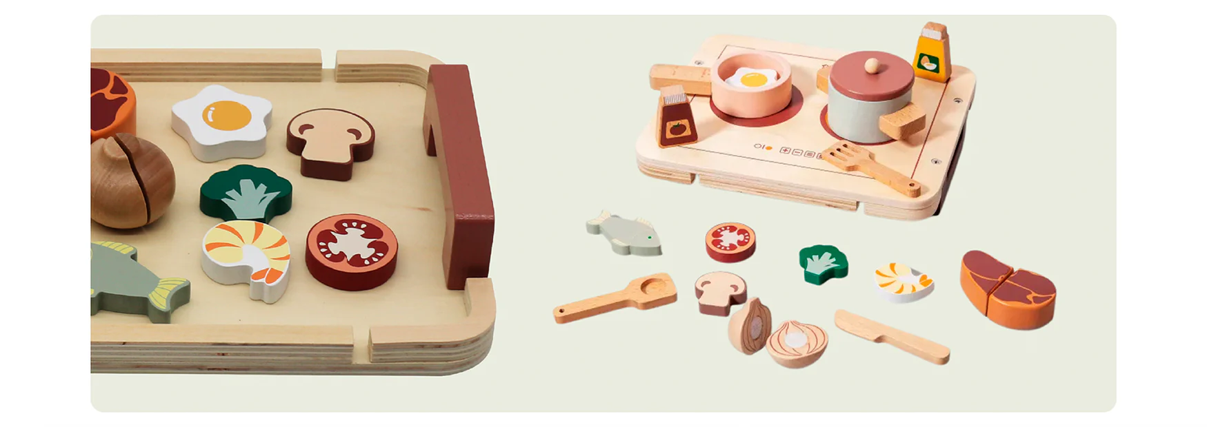 • Incluye cocina de madera, ollas, sartén, espátulas, cuchillos, alimentos (carne, huevo, camarón, vegetales) y condimentos.