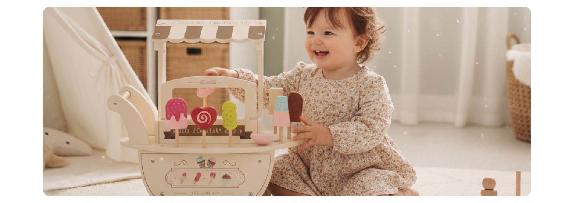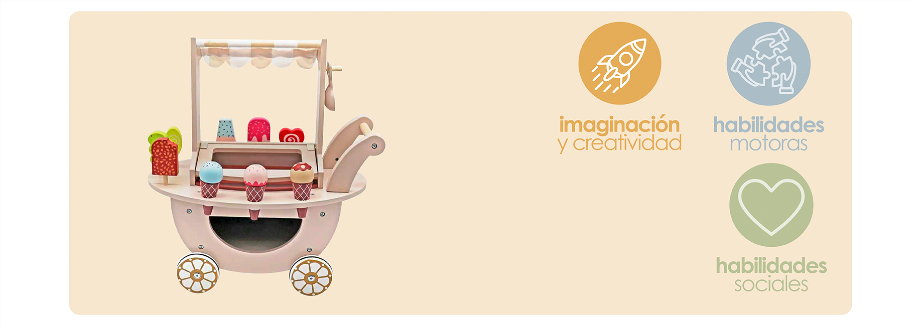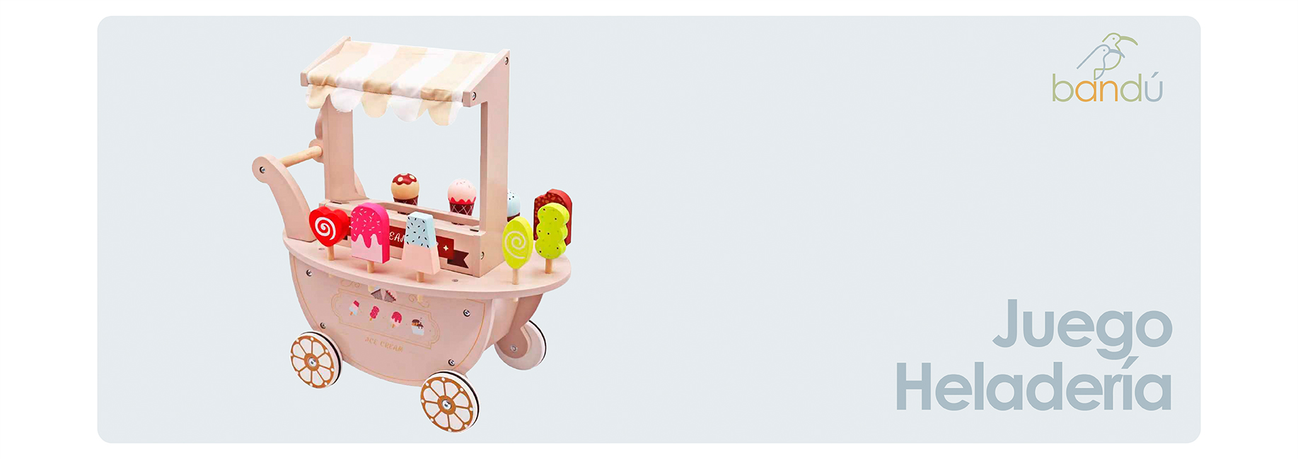 13 coloridos accesorios como: conos de helado, paletas, cuchara, monedas, y más. ¡Atrévete a llevar la dulzura y la diversión del verano a casa con el Carrito de Helados de Madera Bandú!