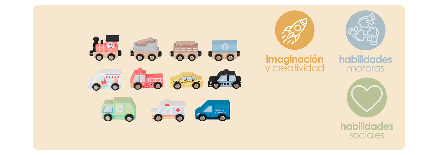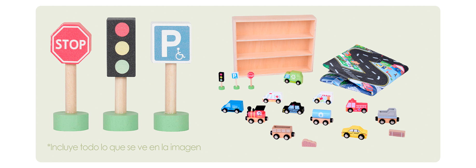 - Incluye autos, tren, pistas encajables y señaléticas de madera.