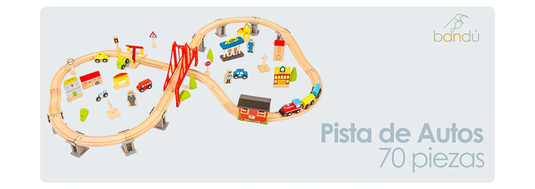 La Pista de Autos y Tren de Madera Bandú de 70 piezas es un completo set de juego que permite construir, explorar y crear historias en un mundo de trenes, autos y edificios. Ideal para desarrollar habilidades cognitivas, motrices y sociales mientras se juega de forma libre y creativa.