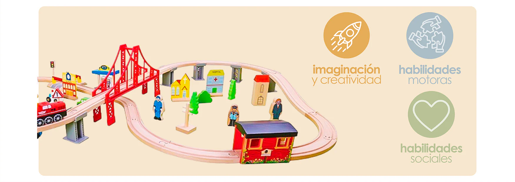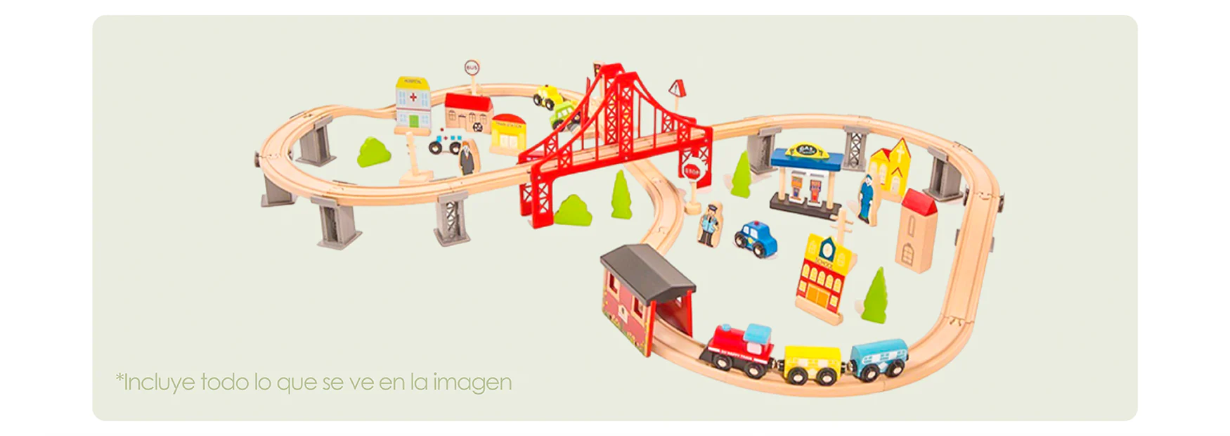 •⁠ ⁠Contiene 70 piezas: rieles de madera, autos, trenes, figuras humanas, árboles, puentes, edificios y señaléticas.
