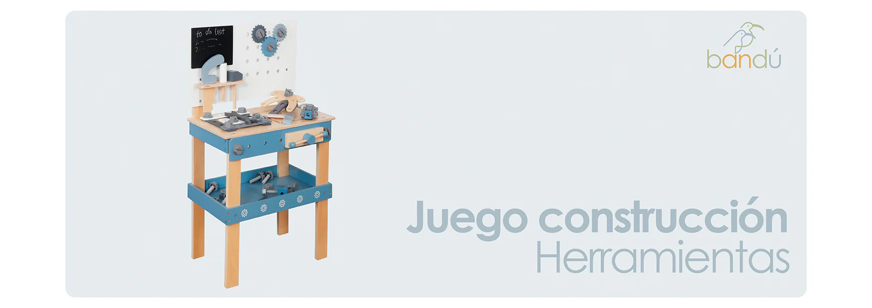 Este completo set de herramientas de madera es perfecto para que niños y niñas descubran el mundo de la construcción de forma segura y entretenida. Diseñado para fomentar el juego creativo y el desarrollo de habilidades motoras, este banco de trabajo Bandú es mucho más que un juguete: es una herramienta de aprendizaje.