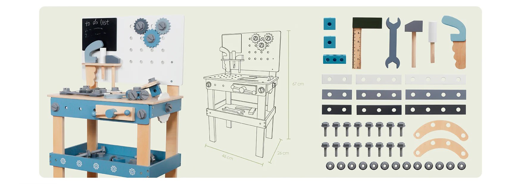 • Incluye múltiples piezas de madera: martillo, destornillador, llave inglesa, tuercas, pernos y más.
