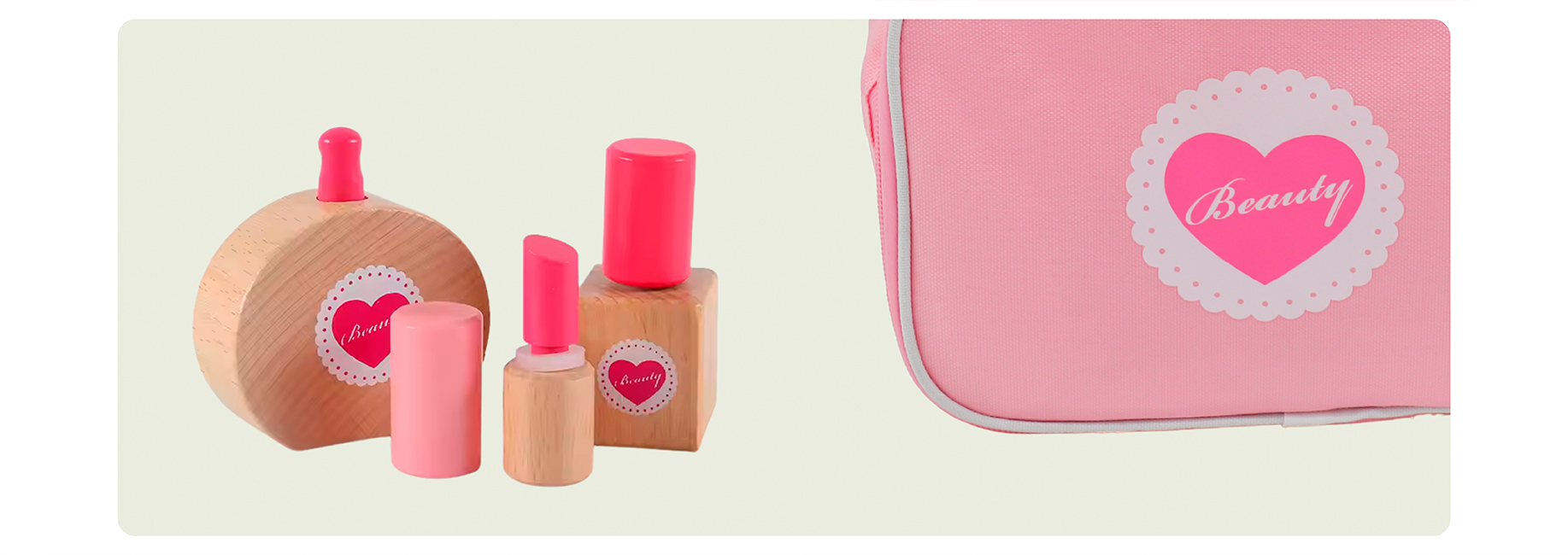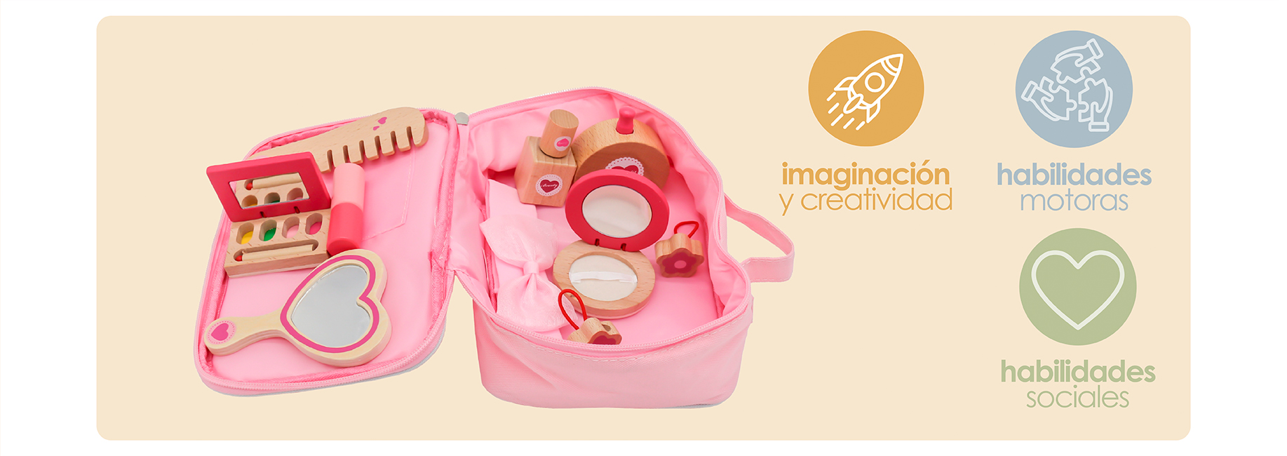 - Incluye múltiples piezas de madera: espejo, secador, peine, esmaltes, lápiz labial y más.