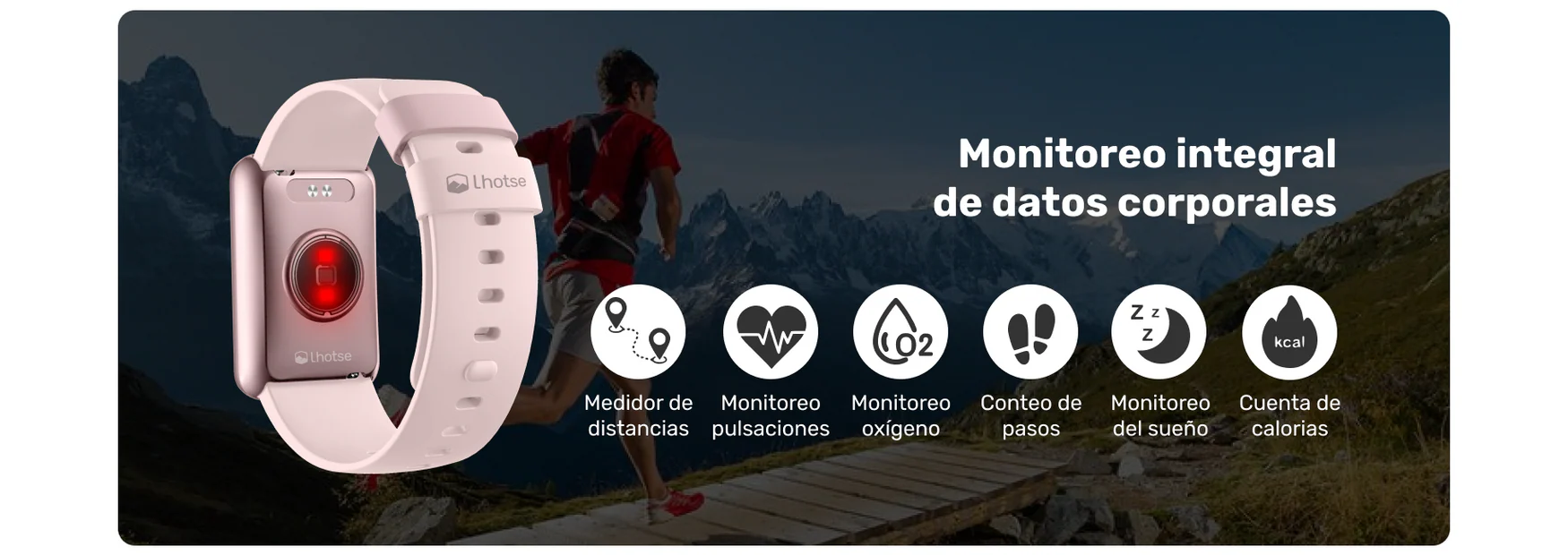 • Mediciones: Ritmo cardíaco, calidad de sueño, calorías quemadas, pasos, distancia recorrida, presión arterial, oxígeno en la sangre, etc.