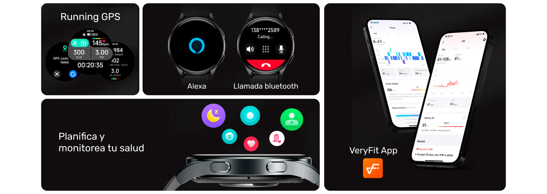 • Medición de parametros de salud: Sueño, ritmo cardiaco, estress, energía corporal, oxígeno en la sangre, etc