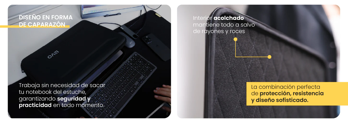 Pero su verdadera magia radica en su funcionalidad, gracias a su estructura en forma de caparazón, puedes trabajar sin necesidad de sacar tu notebook del estuche, garantizando seguridad y practicidad en todo momento.