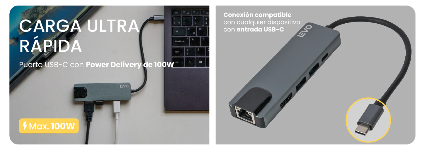 Expande la conectividad de tu laptop, PC o tablet con este Hub USB-C Adaptador Multipuerto 5 en 1 LEVO. Conéctalo al puerto USB-C de tu equipo y accede a múltiples puertos, incluyendo una conexión de red por cable, sin sacrificar velocidad ni rendimiento.