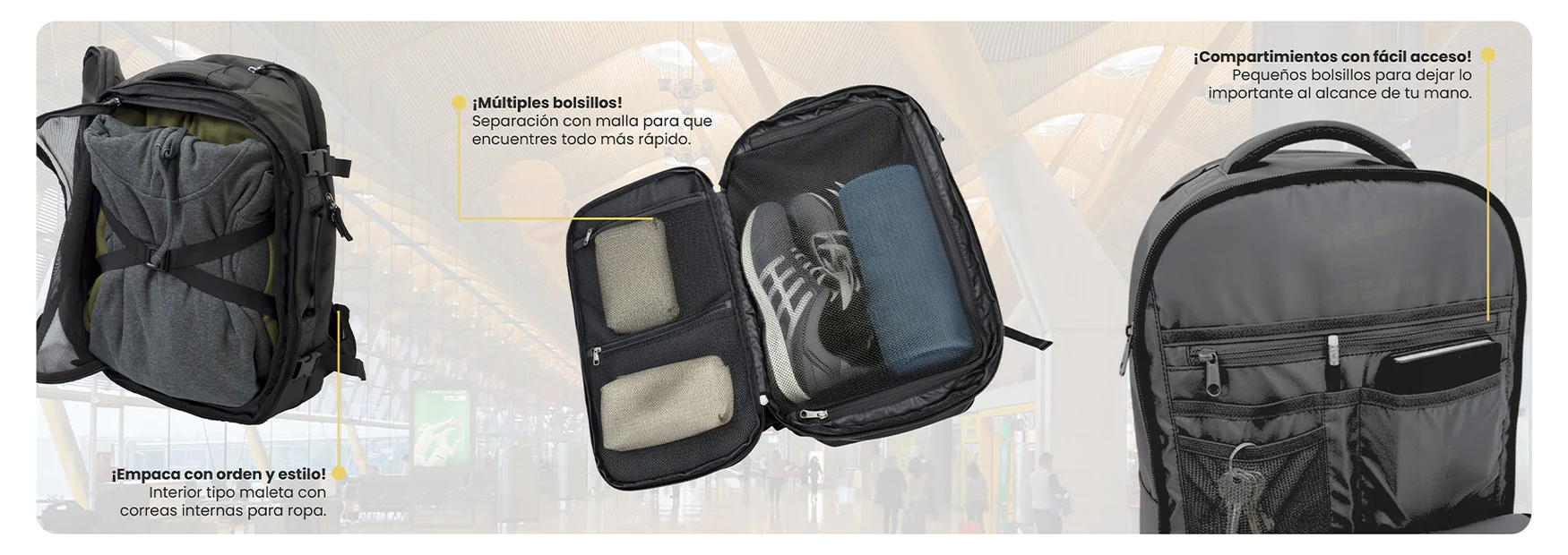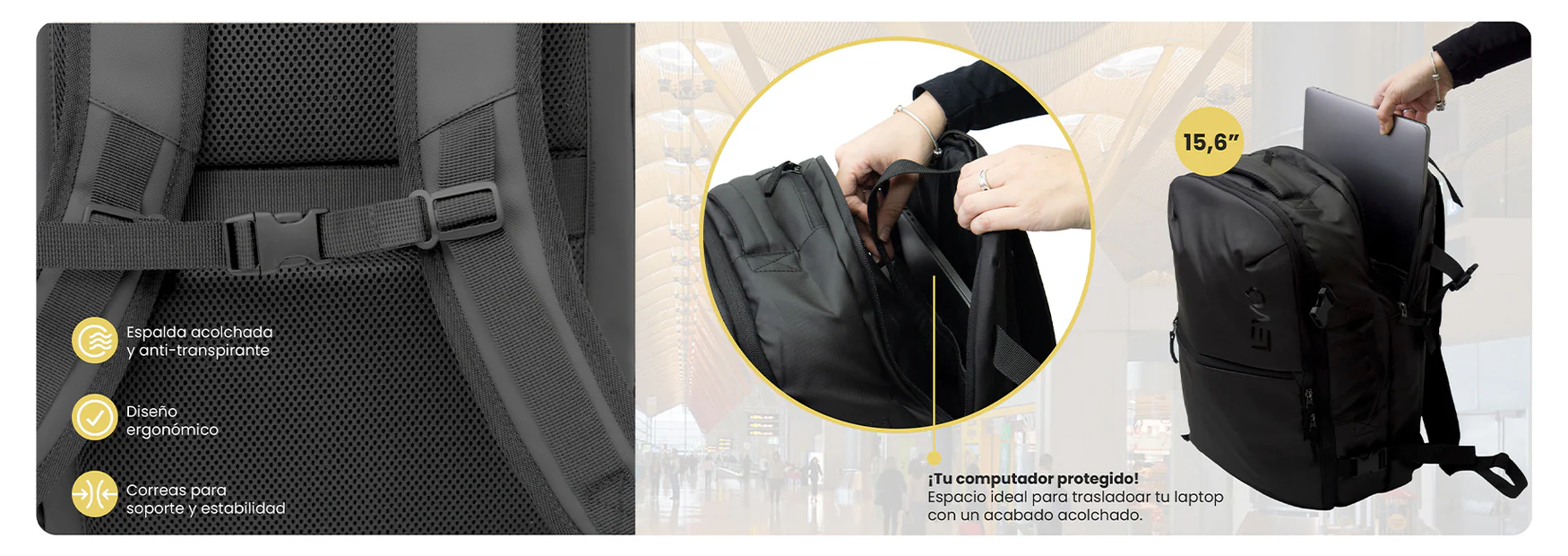 Su respaldo ergonómico acolchado y correas ajustables ofrecen una experiencia de uso ultra cómoda, incluso en trayectos largos. Cada compartimento está estratégicamente pensado para organizar con eficiencia tu notebook, accesorios personales y artículos de viaje, manteniendo todo siempre al alcance.