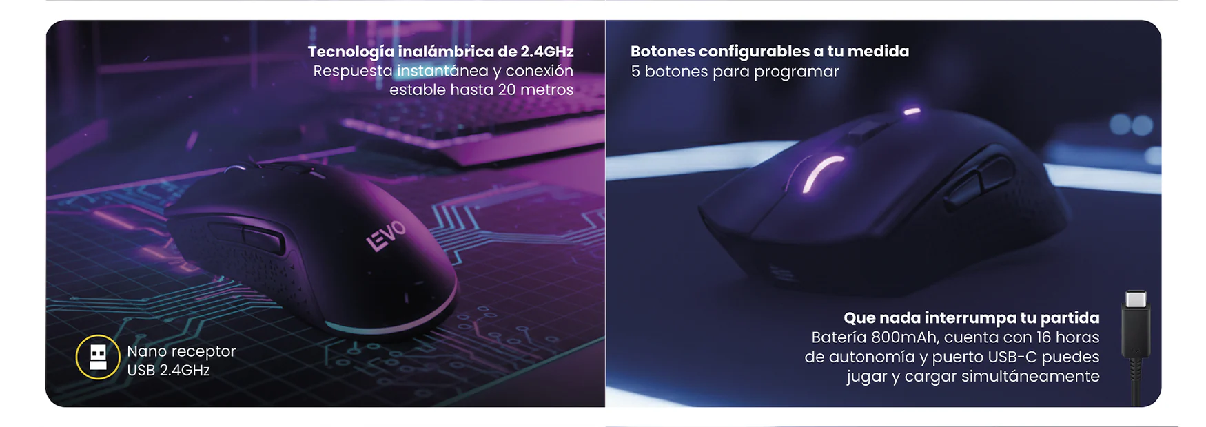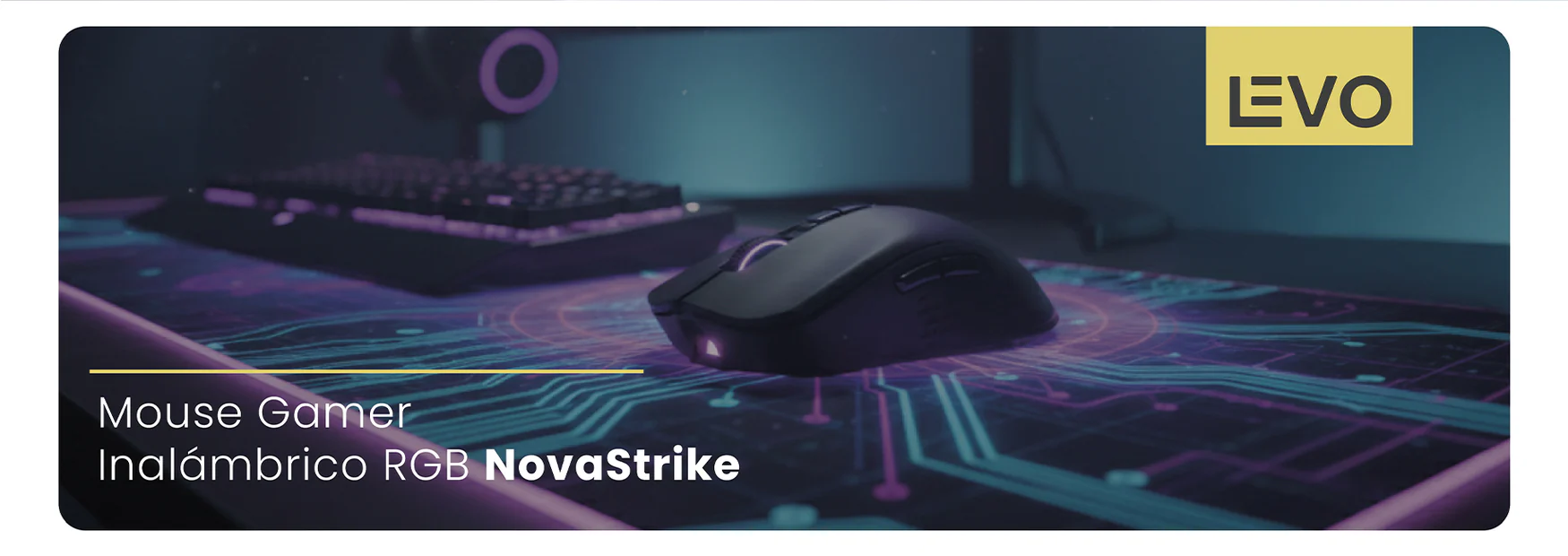El Mouse Inalámbrico Gamer NovaStrike LEVO es un ratón de alto rendimiento diseñado para gamers. Ofrece una conexión inalámbrica estable de 2.4 GHz con una tasa de retorno de 1000 Hz y un alcance de hasta 20 metros.