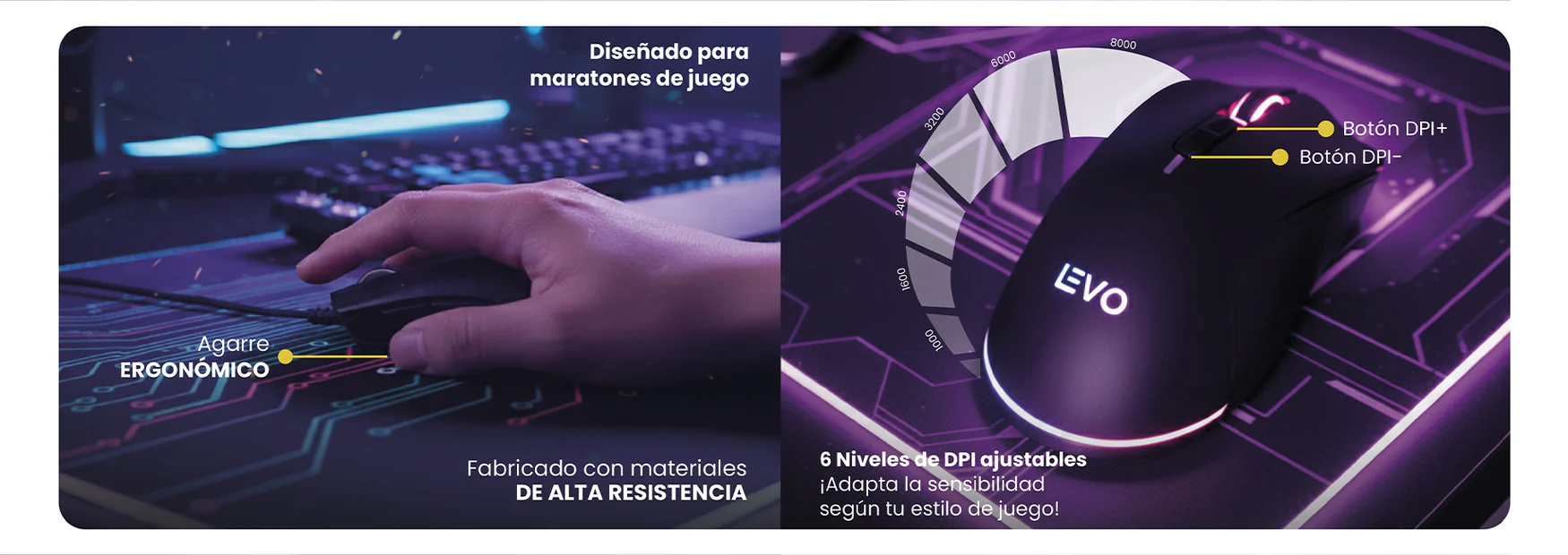 Equipado con un sensor óptico PAW3104DB, garantiza un seguimiento preciso y consistente. Permite ajustar la sensibilidad con 6 niveles de DPI, de 1000 a 8000, para adaptarse a distintos estilos de juego. Su diseño ergonómico de plástico ABS de tacto suave está pensado para reducir la fatiga en sesiones largas.