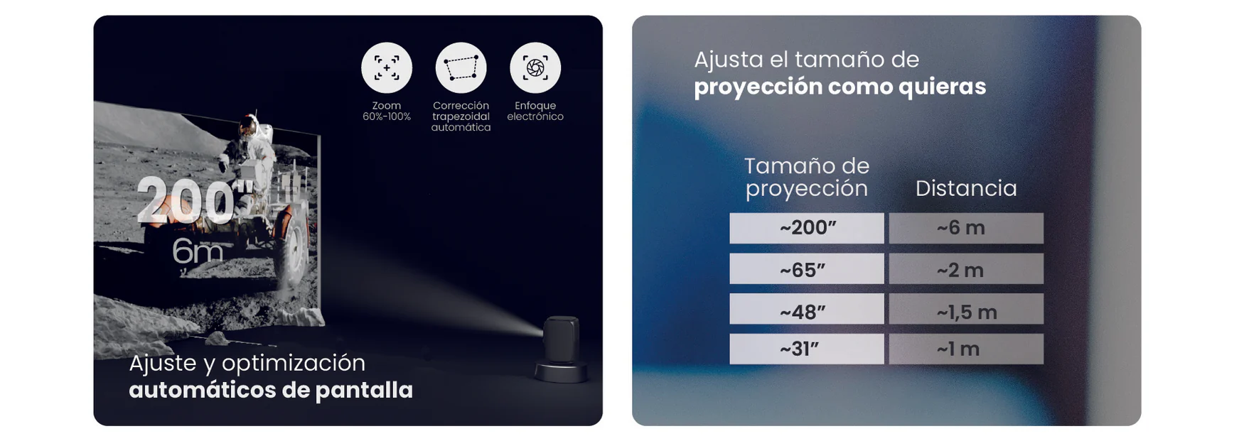 • Pantalla de 25” a 160” con una distancia de proyección de 0.8m a 4.9m.