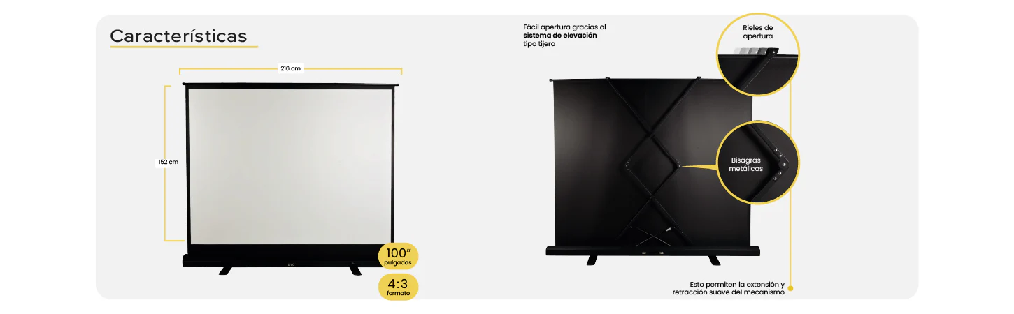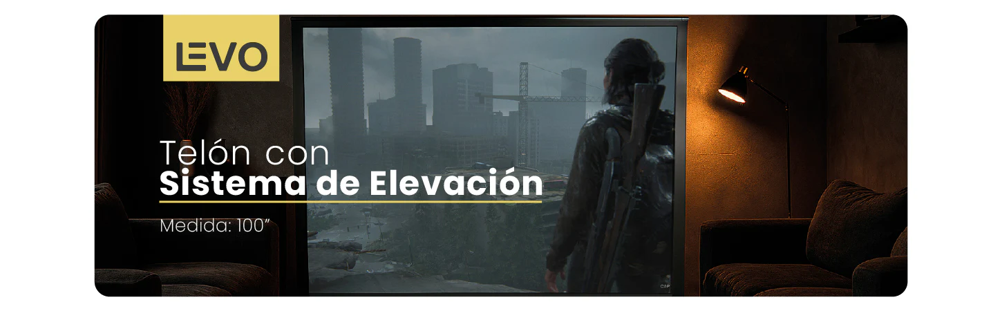 Convierte cualquier espacio en una sala de cine con el Telón retráctil LEVO de 100 pulgadas. Diseñado para máxima portabilidad y funcionalidad, este telón se despliega desde el suelo mediante un sistema de elevación manual tipo tijera, sin necesidad de instalaciones ni herramientas.
