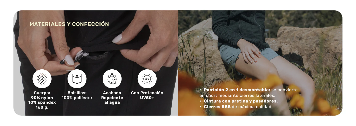 • Pantalón 2 en 1 desmontable: se convierte en short mediante cierres laterales.