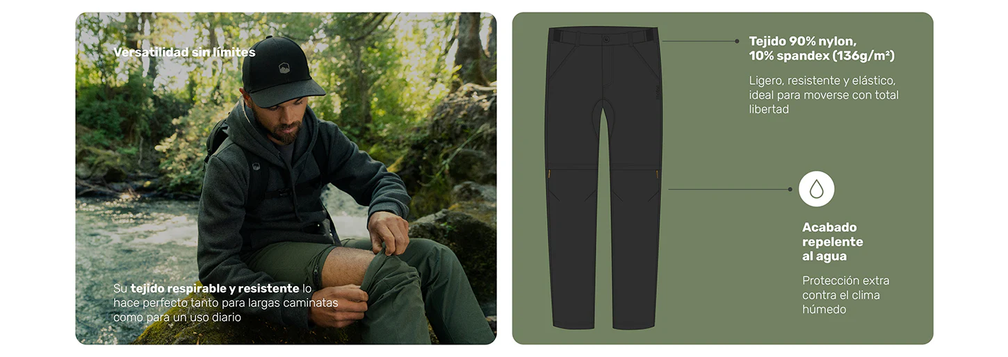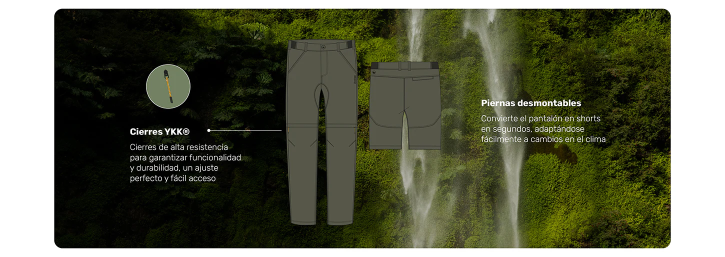 • Piernas desmontables: Convierte el pantalón en shorts en segundos, adaptándose fácilmente a cambios en el clima.