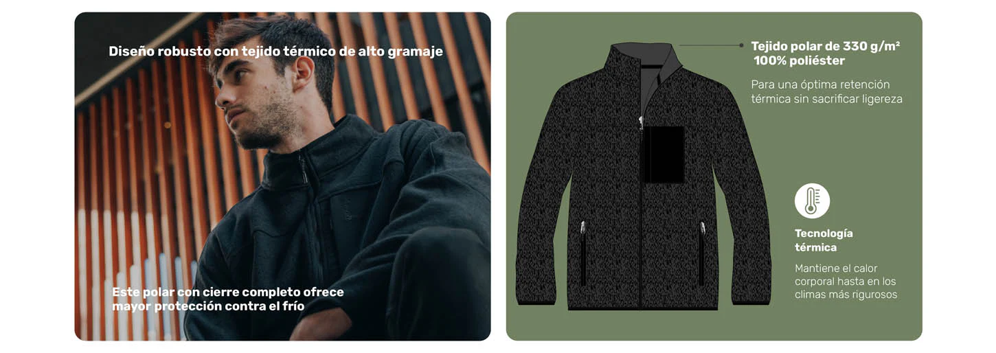 Diseño robusto con tejido térmico de alto gramaje. Este polar con cierre completo ofrece mayor protección contra el frío, siendo ideal para jornadas prolongadas en exteriores o como abrigo principal en climas templados.