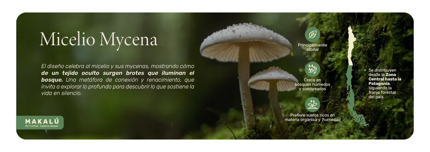 • El diseño celebra al micelio y sus mycenas, mostrando cómo de un tejido oculto surgen brotes que iluminan el bosque. Una metáfora de conexión y renacimiento, que invita a explorar lo profundo para descubrir lo que sostiene la vida en silencio.