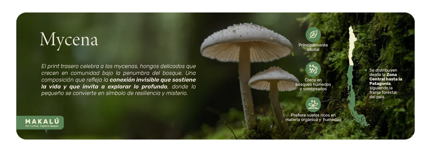 • El print trasero celebra a las mycenas, hongos delicados que crecen en comunidad bajo la penumbra del bosque. Una composición que refleja la conexión invisible que sostiene la vida y que invita a explorar lo profundo, donde lo pequeño se convierte en símbolo de resiliencia y misterio.