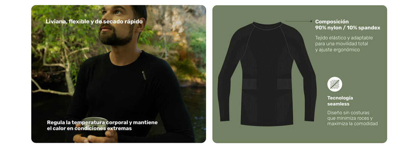 Diseñada para acompañarte en movimiento, esta primera capa es tu mejor defensa contra el frío. Su tecnología Seamless elimina costuras incómodas, minimizando roces y maximizando la comodidad incluso en actividades intensas.