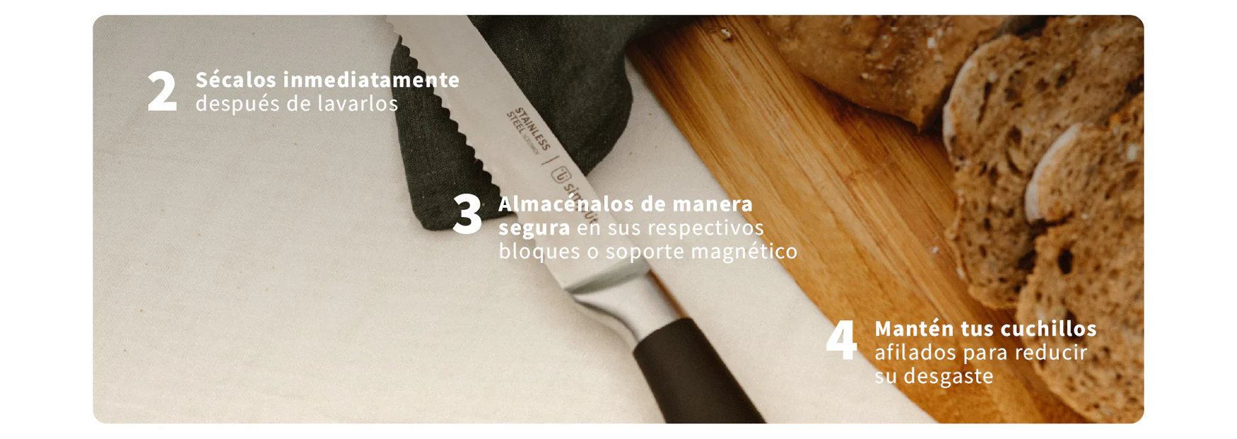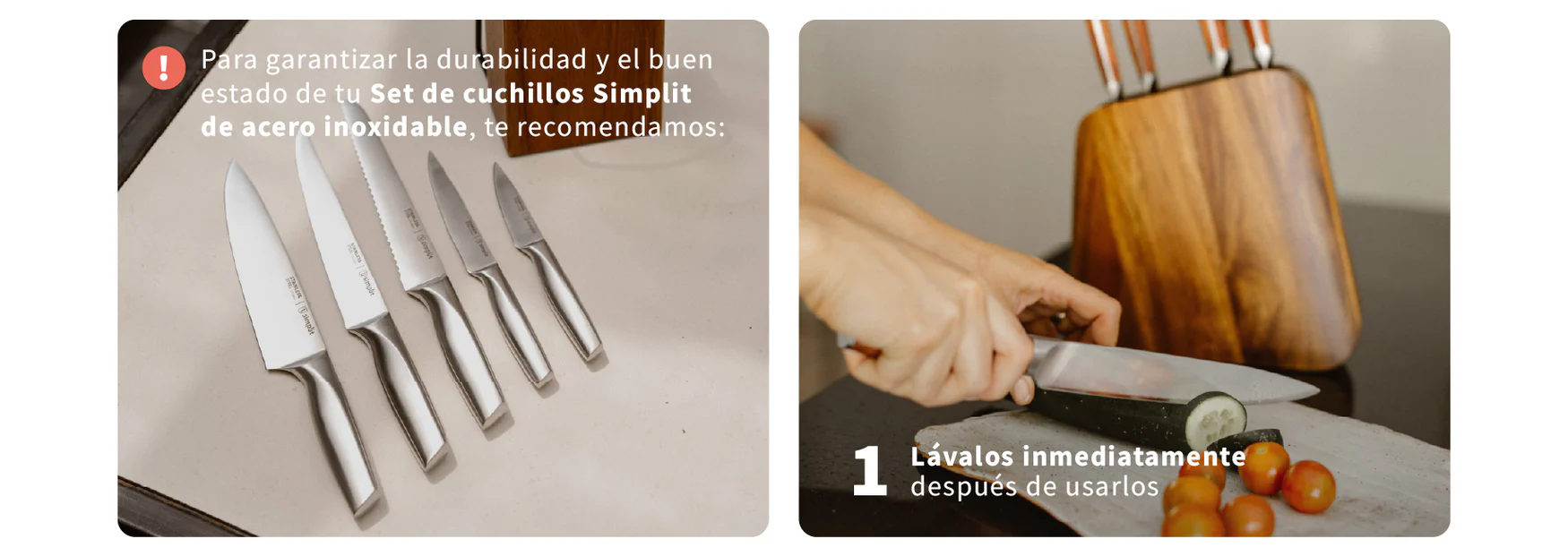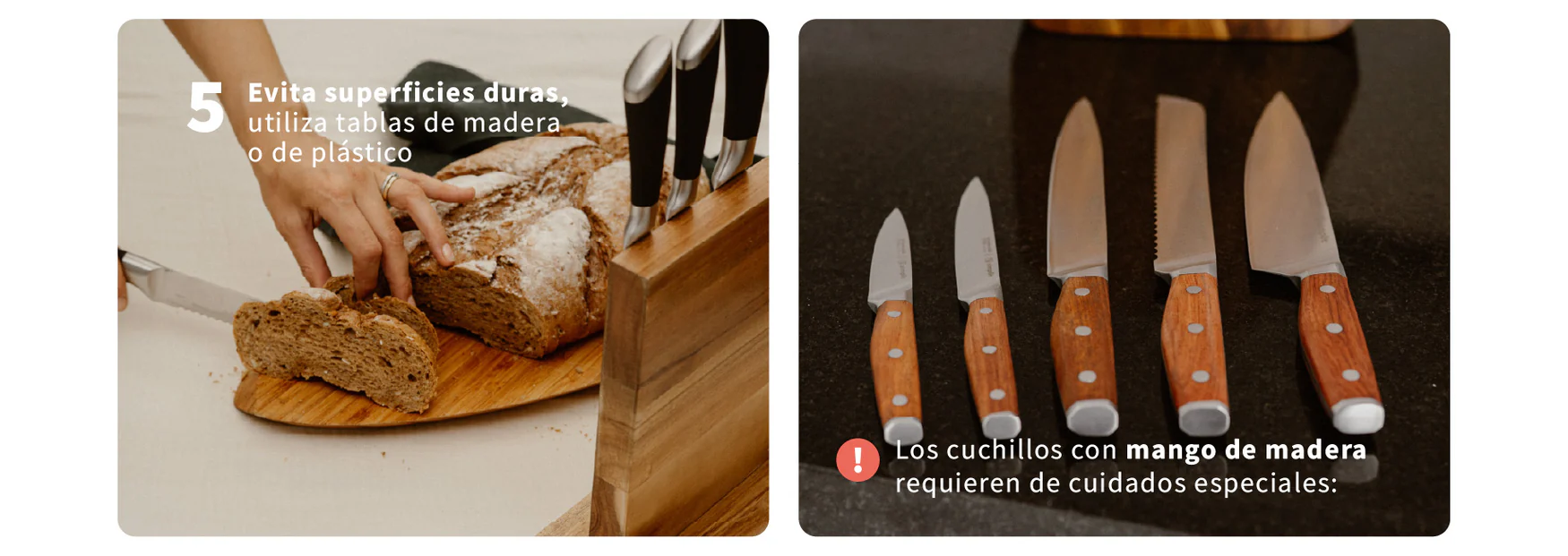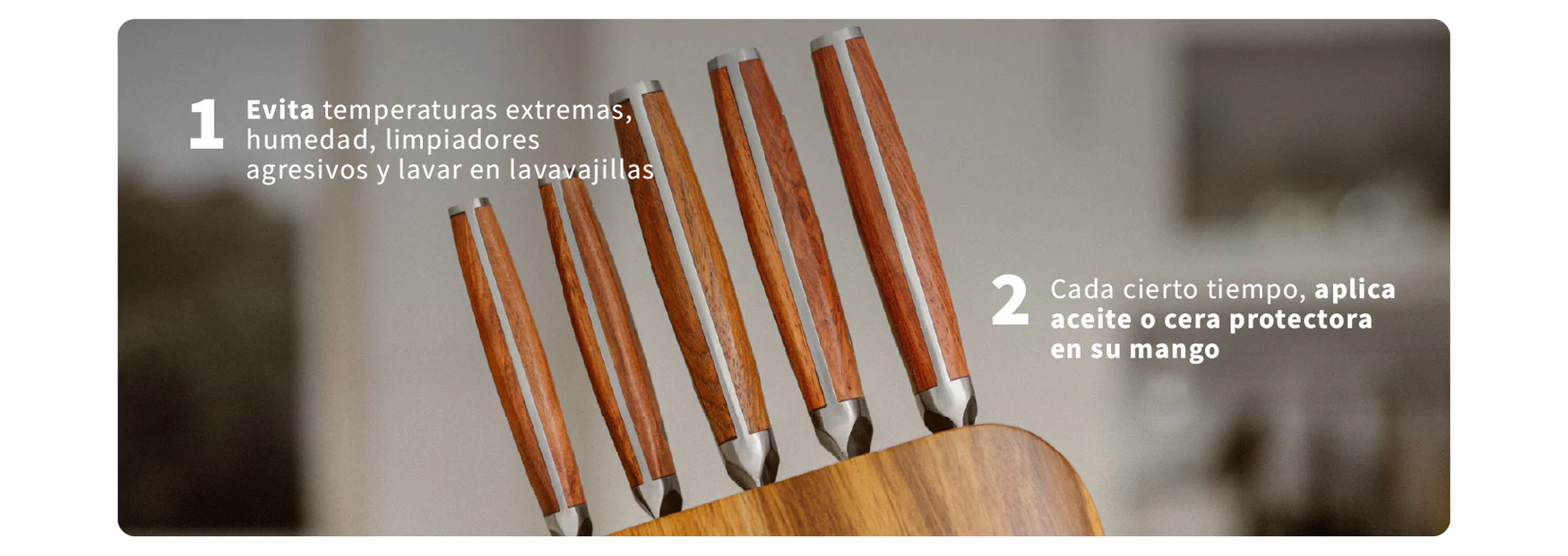 • Completa el set un elegante taco de madera para mantener tus cuchillos organizados y listos para usar.