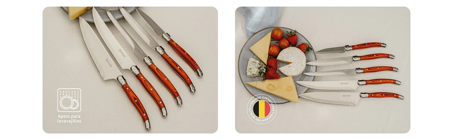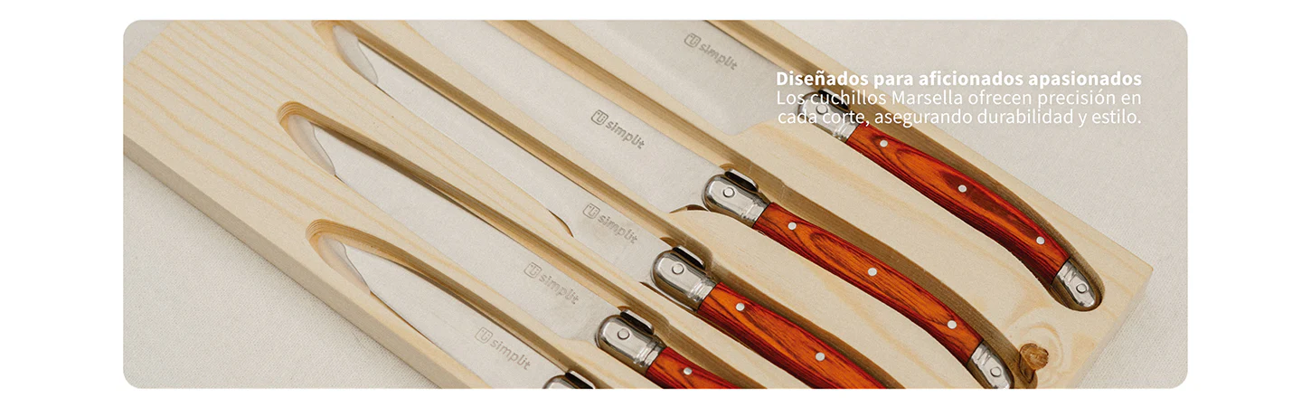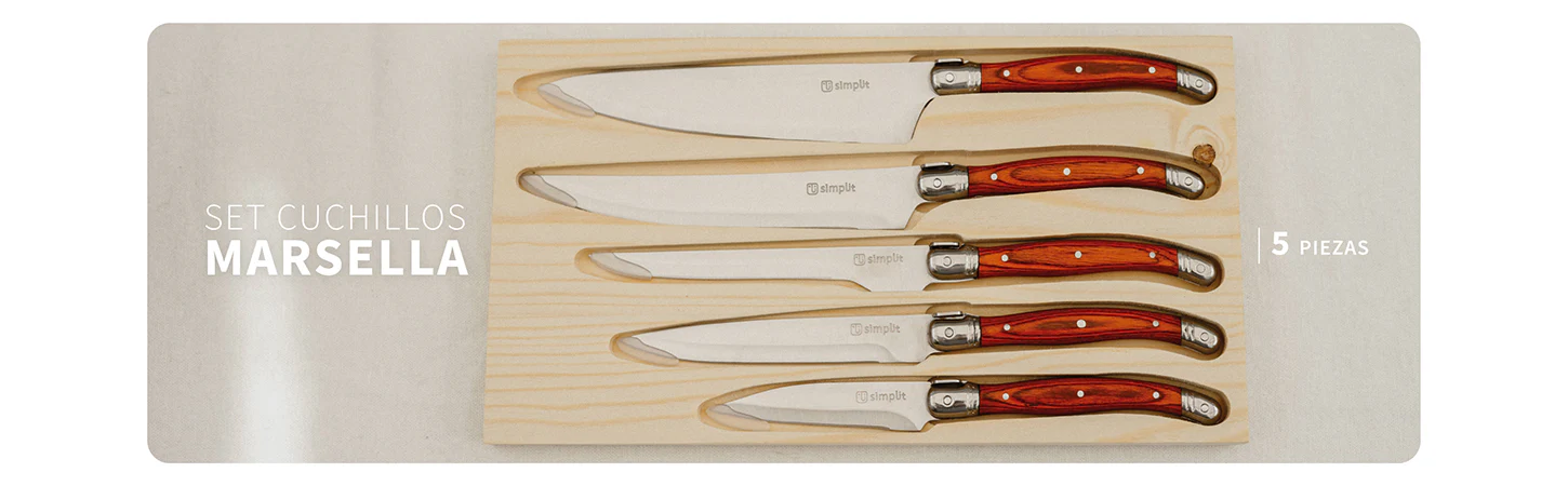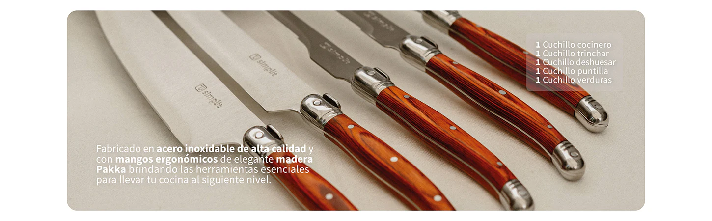 Descubre el equilibrio perfecto entre funcionalidad, calidad y diseño con el Set de Cuchillos Marsella de Simplit. Este set de 5 piezas, fabricado en acero inoxidable de alta calidad y con mangos ergonómicos de elegante madera Pakka, te brinda las herramientas esenciales para llevar tu cocina al siguiente nivel. Diseñados para chefs profesionales o aficionados apasionados, los cuchillos Marsella ofrecen precisión en cada corte, asegurando durabilidad y estilo en cada uso. Además, son aptos para lavavajillas, facilitando su limpieza sin comprometer su calidad.