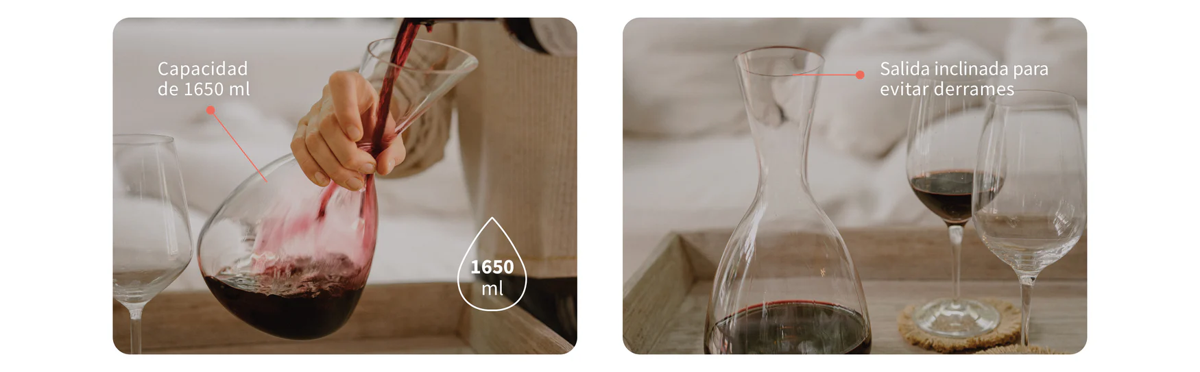 Con su elegante diseño curvo y su imponente capacidad de 1650ml, permite que el vino respire y despliegue todos sus aromas y sabores, elevando cada sorbo a su máxima expresión. Su innovador agujero en la base no solo añade un toque distintivo, sino que también asegura un agarre cómodo y seguro, facilitando su uso en cualquier ocasión.