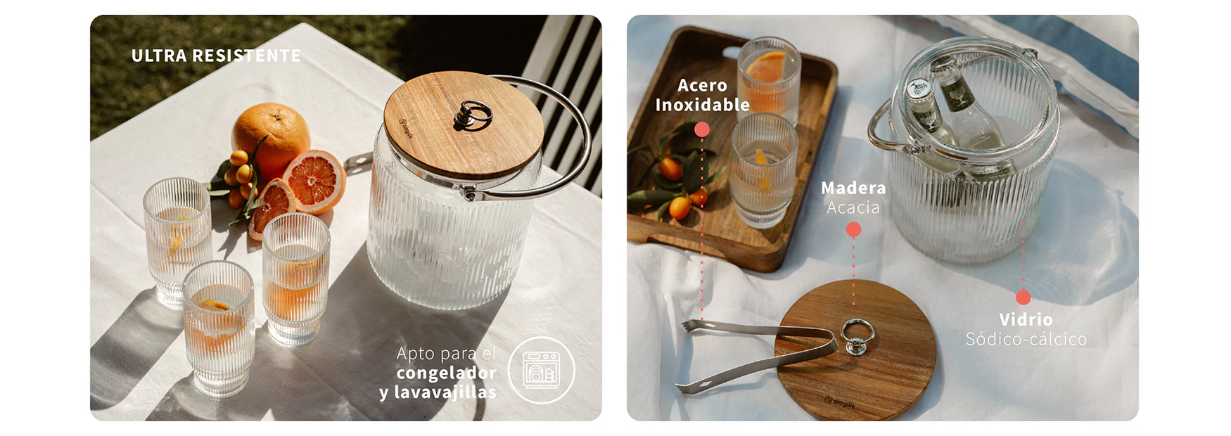 Transforma cada reunión en una experiencia única con la Hielera Charlotte de Simplit, un equilibrio perfecto entre funcionalidad y diseño elegante. Fabricada en vidrio resistente de alta calidad, esta hielera no solo conserva tus hielos perfectos por más tiempo, sino que añade un toque de sofisticación a tu mesa o bar. Su tapa de madera de acacia, con su cálido acabado natural, aporta un contraste único que combina estilo y practicidad. Además, incluye pinzas de acero inoxidable, pensadas para facilitar el servicio y mantener la higiene en cada ocasión.