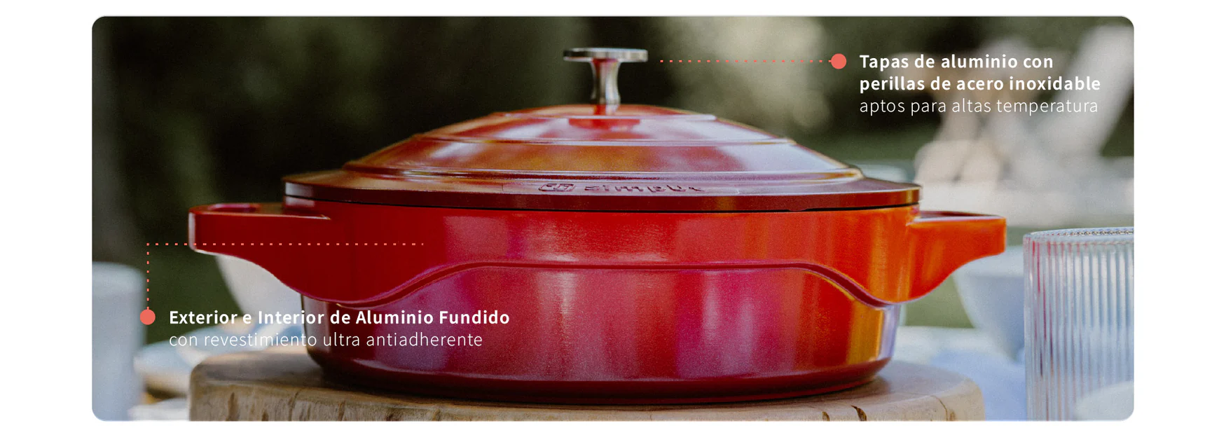 Gracias a su tecnología de circulación auto humectante, la tapa devuelve los jugos y vapores naturales a los alimentos, resaltando los sabores y conservando los nutrientes. Además, su mango desmontable de tacto frío proporciona comodidad y seguridad al cocinar, optimizando el espacio al guardarla. Es apta para horno, lo que la hace perfecta para recetas versátiles y para lucirla como una elegante fuente en la mesa.