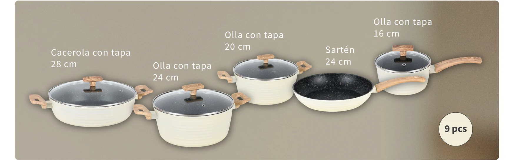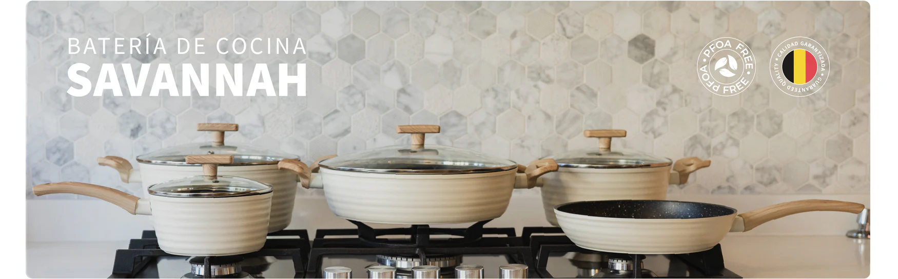Descubre la elegancia y funcionalidad con la Batería de Cocina Antiadherente Savannah de 9 Piezas. Fabricada en aluminio forjado de alta calidad, con un revestimiento antiadherente de mármol que asegura una cocción sin esfuerzo. Compatible con todas las cocinas, incluso inducción, y con mangos de baquelita resistentes al calor para un agarre seguro. Ideal para quienes buscan un diseño sofisticado y duradero en su cocina. ¡Transforma tu forma de cocinar con Savannah!